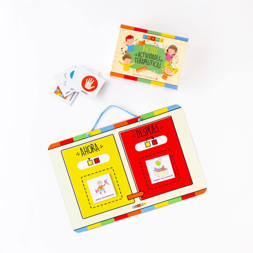 La pizarra puede adquirirse con o sin pictogramas. Este kit contiene la pizarra de 20 x 30cm, y 40 pictogramas de actividades terapèuticas con las siguientes imágenes: