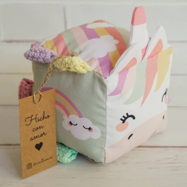 Cubo sensorial realizado en Microplana sublimada, súper suave al tacto! - Sonajero interno - Tiritas tejidas de agarre