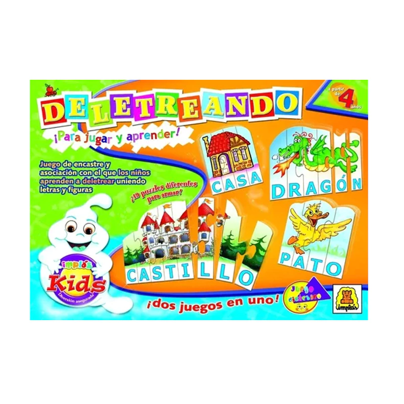 Juego de encastre y asociacion con el que los niños aprenden a deletrear uniendo letras y figuras.