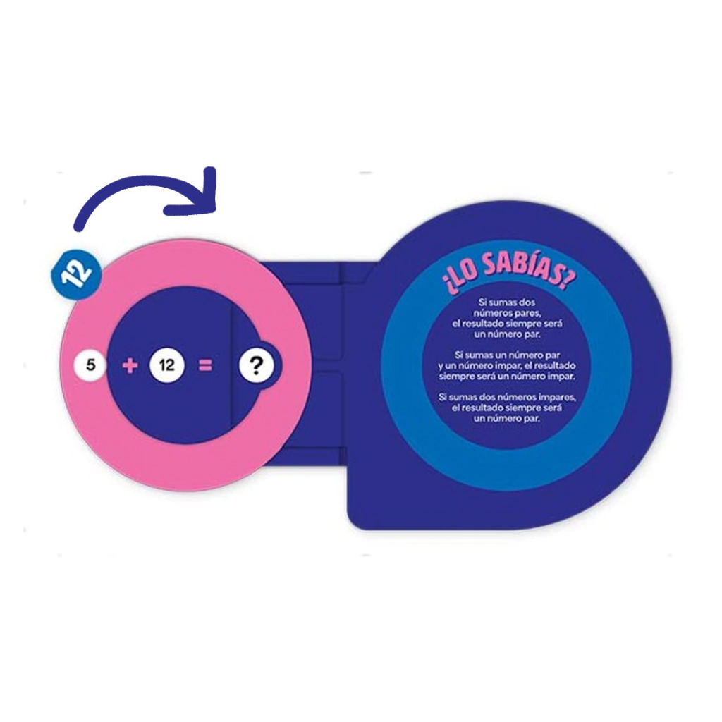 Es un libro circular que contiene pestañas deslizantes y solapas que se abren mostrando el resultado, para realizar sumas en forma divertida.