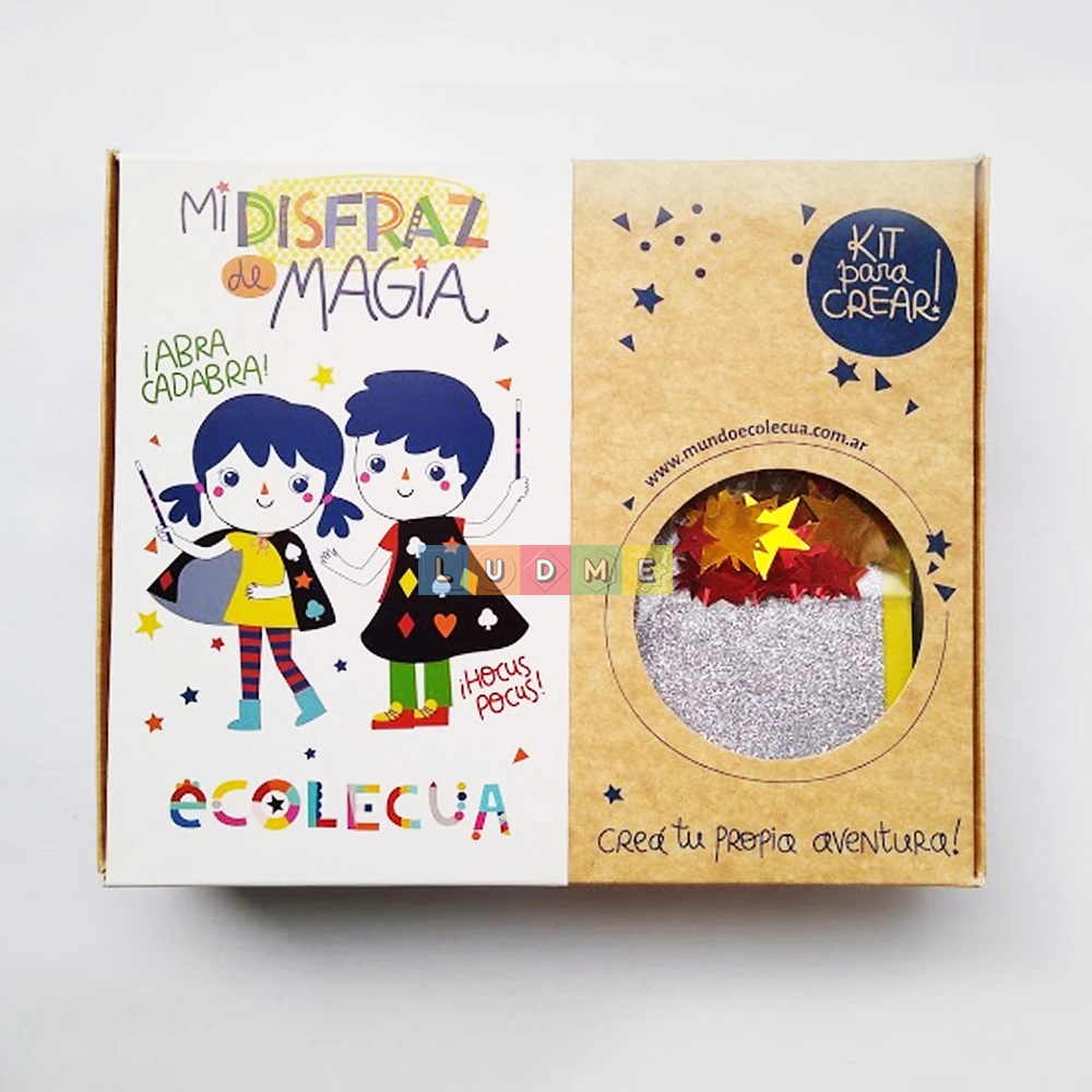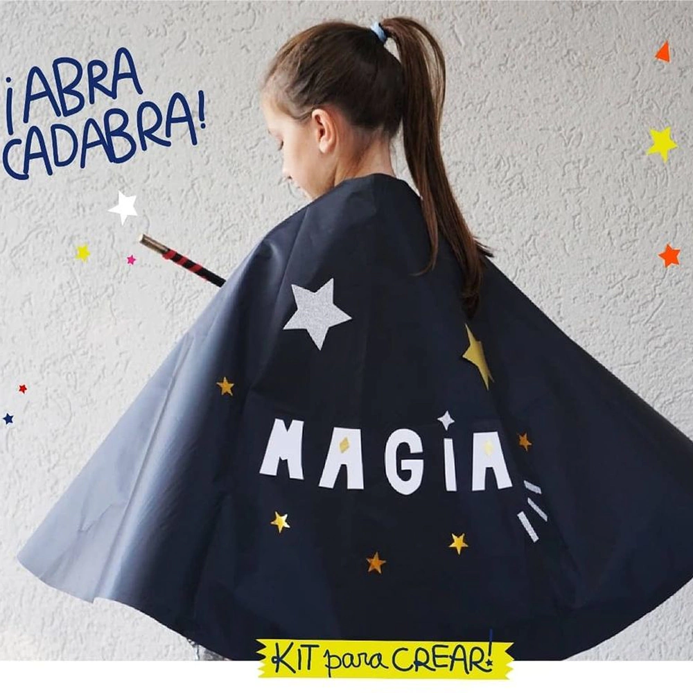 Contiene: Capa de mago, varita de madera, témperas, goma eva de colores, goma eva con glitter, lentejuelas, telas, pegamento y glitter. También, guía e instrucciones.