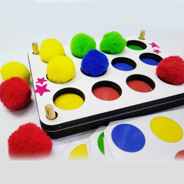 Juego para desarrollar la motricidad fina, basado en la copia de modelos, cuyo objetivo es colocar los pompones de acuerdo a la referencia de colores indicada en el tablero.