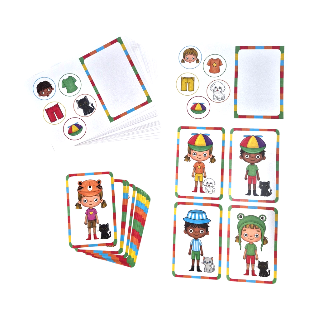 Los niños deben elegir la carta que reúne todas las características indicadas en la tarjeta base, combinando ropa, colores, accesorios y mascota.