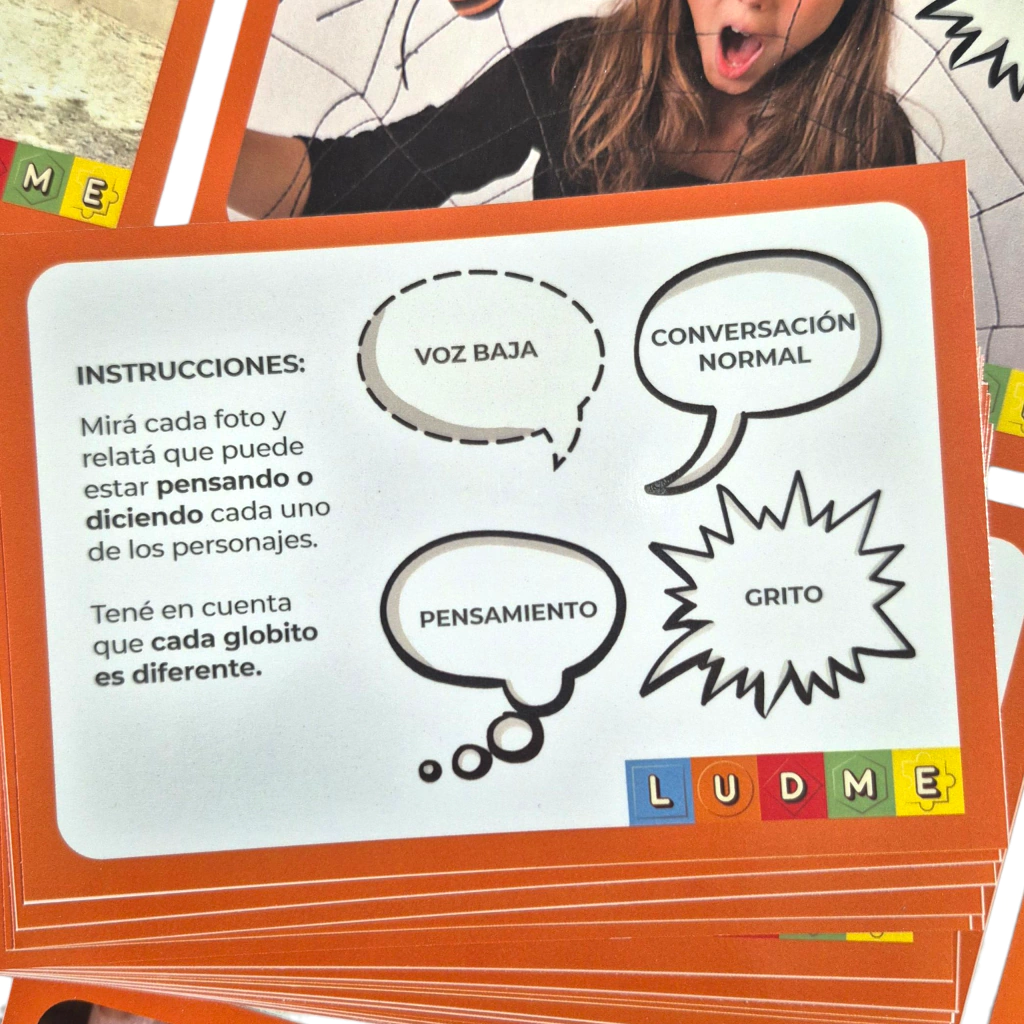 Juego de tarjetas laminadas con imágenes de situaciones disparadoras en la que se deberá expresar qué es lo que las diferentes personas están pensando (globo de pensamiento) o diciendo (globo de diálogo)