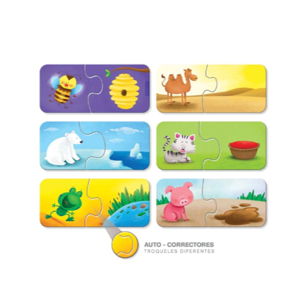 Incluye 12 rompecabezas (abeja, buho, camello, cerdo, elefante, gallina, gato, hormiga, oso, perro, pez, rana).