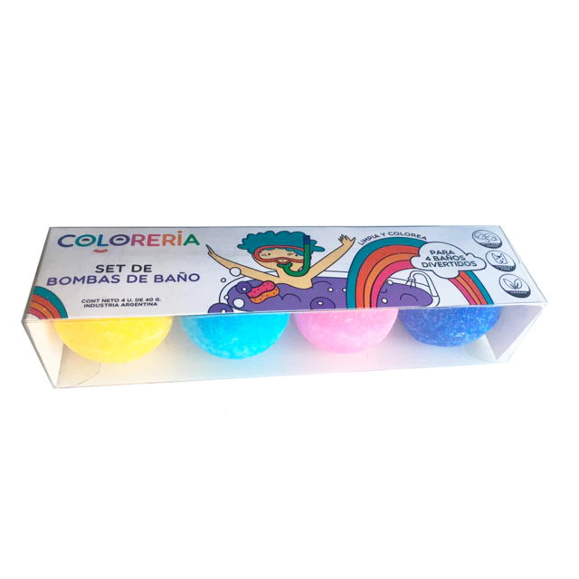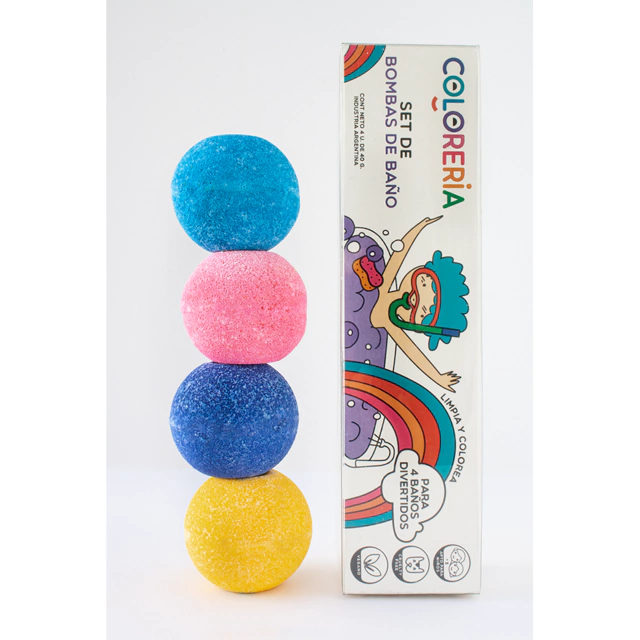 Contiene 4 bombas de colores (rosa, celeste, amarillo y violeta)